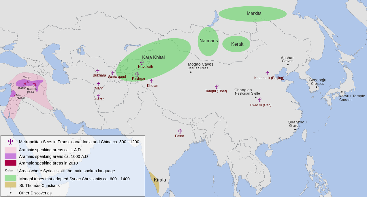 The extent of Syriac Christianity in Asia and the Aramaic language in the Near East. Green represents Mongol tribes that adopted Christianity