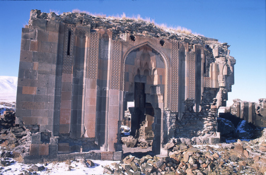 Gagik’s Church (Gagkashen) at Ani, 1001-6 A.D. The columns of the exedrae at Gagkashen are also of the Ionic order, but do not feature Greek monograms like those at the Zvartnots cathedral four centuries before.