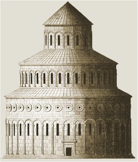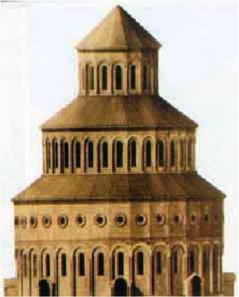 Zvartnots Church, the patriarchal resident of Nerses III (640-661 A.D.). The setting in the landscape of the church must have been deliberately aligned with Mount Ararat. The Ionic capitals of the exedrae are engraved with the framed circular monogram “Narsou” (“of Nerses”) in Greek.