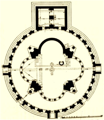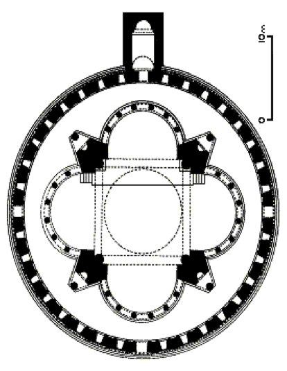 Perhaps one of the most outspoken examples of the medieval revival can be observed in the comparison between the 7th century Zvartnots Church near Echmiadzin and the 11th century Gagkashen Cathedral at Ani, which was constructed by Trdat. Both of the churches feature aisled tetraconch plans, with four large, W-shaped piers and exedrae comprised of six columns. Both structures feature stylobates and both were built employing rubble masonry, which was typical of Armenian churches as opposed to ashlar masonry in Syrian churches. Zvartnots is the largest aisled tetraconch in the Caucasus, and it lies within an extensive patriarchal or Episcopal palace complex. Most scholars agree on the rotunda plan of Zvartnots, with arched windows and a ring of oculi. What is most important in analyzing Zvartnots is understanding the socio-political context of its founding. The 7th century A.D. witnessed a cosmic confrontation of two age-old foes: the Byzantines and the Sassanid Persians. From a Christological standpoint, the Armenians condemned the doctrine of Monophysitism, but also rejected the Orthodox doctrine of the Byzantines, which professed the duality of Christ’s nature, as proclaimed by the fourth ecumenical council at Chalcedon in 451 AD. But the geographical location of Zvartnots in the Byzantine Empire adjacent to the Sassanian border thus necessitated the development of a sort of “cultural allegiance” to Constantinople, which manifested itself in the form of visual vocabulary in architectural forms. In this vain, the local leader Nerses III had in fact religiously aligned himself with the Byzantines. This motivation in turn allowed for the transmission of a number of architectural innovations from a Byzantine milieu into Armenian Church architecture, as evidenced by the church of Zvartnots. The first is the use of columns and exedrae in the interior of the church, which is evident in Byzantine churches in western Anatolia, a prominent example of which is the Hagia Sofia. The columns composing the exedrae at Zvartnots are of the Ionic order, however they have been “Armenized” by the use of local knot motifs in a fashion similar to the Dvin “Ionic” capital from the 5th-6th centuries. Nerses III’s deliberate choice to affiliate with the Byzantine world is perhaps best evinced by the use of Byzantine cross monograms with a Greek inscription that reads “Of Nerses”. The eagle images are also appropriated from a Byzantine milieu, where the bird is a symbol of power and divinity. While the Greek monograms themselves are symbols associated with an era of Greek dominance in the politics of historical Armenia, the layout and architectural concept of the church itself as a multi-level rotunda with an interior tetraconch design became a timeless standard in the Armenian repository that was actively drawn upon for centuries to come.