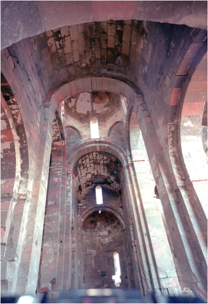 Ani Cathedral is distinguished by its appropriation of exterior sculpture in the contemporary context of the city of Ani. Namely, the entire masonry skin is united by sculpted colonettes and arches, and this became a feature of many Armenian churches in the 10th and 11th centuries. The vaulting of the cathedral is supported by slightly pointed rib-arches that spring from profiled piers, which bear the structural advantage of supporting more load, and adds to the verticality of the structure while affording a greater sense of “linearity” from a stylistic point of view. In addition, the steps of the arches “bind” with the ribbed piers, creating a more integrated interior design. Altogether, the Cathedral of Ani represents a refinement of interior vocabulary used at Mren, in that it takes rudimentary profiling and incorporates it into an aesthetic. These developments are not only telling of continued appropriation of elements from a Byzantine milieu, but also of the masterfulness of Trdat the Architect as a reviser of the simpler forms from the 7th century.