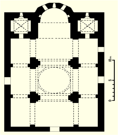 Scale of the Cathedral of Ani, 10th century, west entrance. The dome is supported by pendentives (a European innovation, as opposed to Iranian squinches found at Mren) held up by slightly pointed 3-ribbed arches supported on bundled shafts that spring from profiled piers, in effect giving the interior a strikingly muscular effect and an emphasis on linearity.