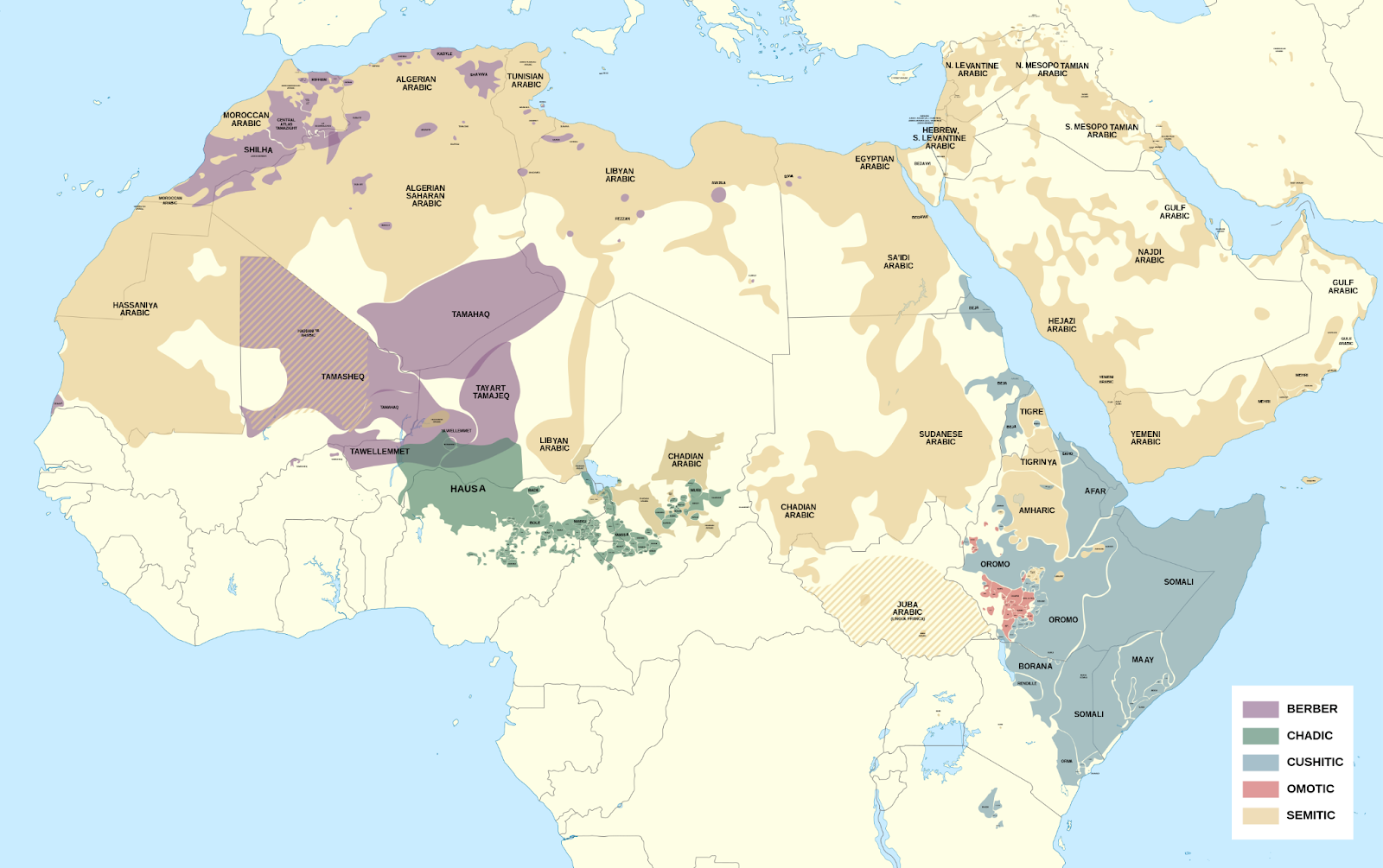 Berber (endonym: ⵜⴰⵎⴰⵣⵉⵖⵜ tamazīɣt; Ar. الامازيغية al-amazīġīyya; الشلحة aš–šilḥa) is a distinct language family belonging to the Afro-Asiatic phylum. Blench (2018) notes that Berber is considerably different from other Afroasiatic branches, and indeed its genetic relation to Arabic–of equal magnitude to its relation with Ancient Egyptian and Cushitic–is vanishingly remote. Proto-Berber probably split from a common ancestor with the other known Afro-Asiatic branches between ~10,000-9,000 years before present, and then this group underwent a putative linguistic bottleneck as recently as ~3,000 years ago, which apparently eradicated the internal diversity of the family and left a contracted number of idioms from which all of the modern Berber languages descend. Proto-Berber then appears to have spread across a vast area from the western banks of the Nile river to the Atlantic coast of North Africa. Today, an estimated 30-40% of Moroccans, 20-30% of Algerians, 5-10% of Libyans and 1% of Tunisians use a Berber language as a mother tongue, but these numbers would have been higher only a century ago.