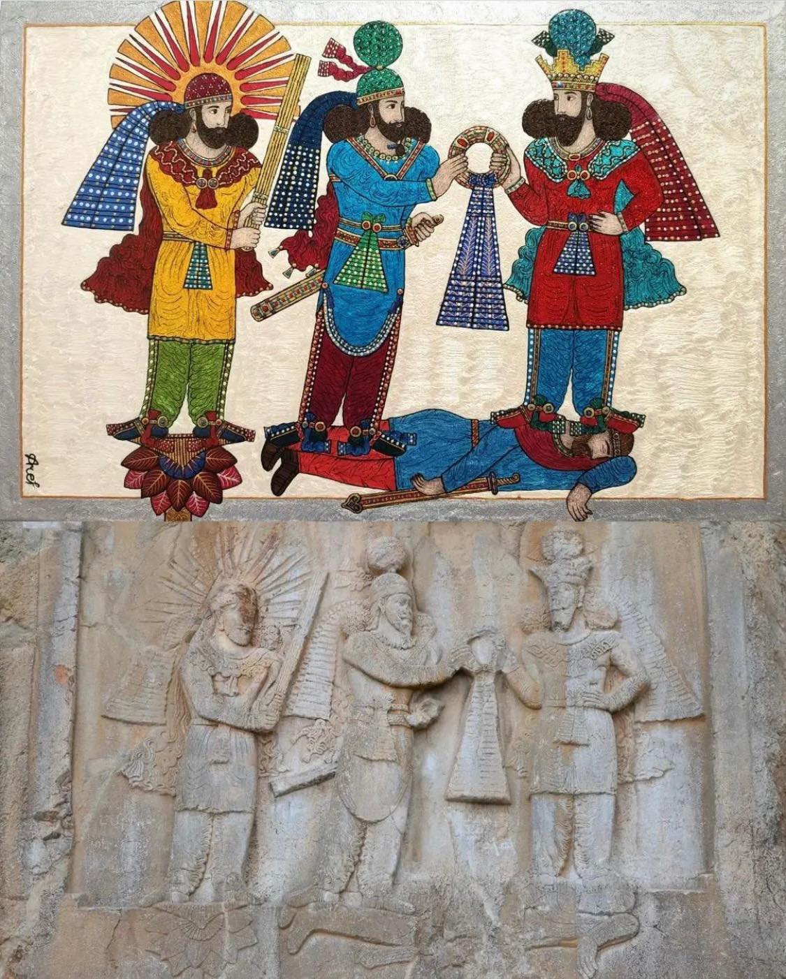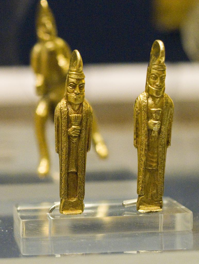 (1) A large relief of the investiture of the Sasanian king Ardashir II at Tāq-i-Bustān, Kermānshāh, Iran (c. 4th century A.D.). King Ardashir II and his predecessor Shapur II stand atop the fallen Roman Emperor Julianus Apostata (361-363 A.D.). The archangel (yazāta) Mithra stands atop a Lotus Flower on the left holding a “barsom”—a bundle of twigs from select medicinal plants used by Zoroastrian priests (Magi) in their role as traditional healers. (2) Gold statuettes carrying barsoms, a symbol of priesthood, discovered as part of the Achaemnid-era “Oxus Treasure” in Qobādiyān, Tajikistan.