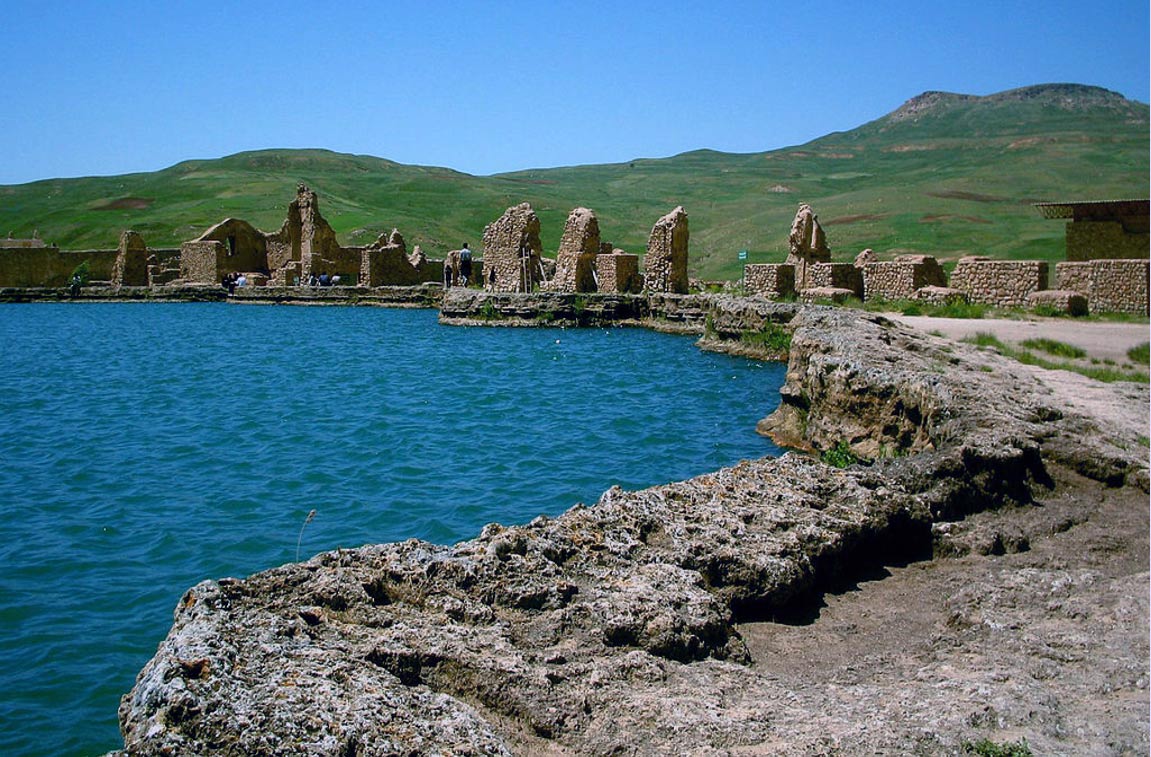 The temple site offers a view of what was called Zendān-e Solaymān since Mongol times; it is a cone-shaped hollow mountain built up of limestone during millions of years by a hot spring underneath. The mountain is 97 to 107 meters tall while its crater is 65 meters wide and around 80 meters deep. The crater was at one time full of water, fed by floor springs, but it dried centuries ago. Shīz, Iran