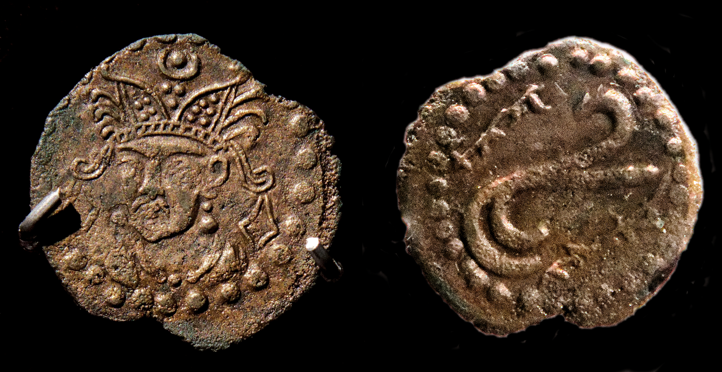 Coin in the name of Raxanč, Afšīn (lord) of Osrūšana. Tamgha symbol on the reverse with name of the ruler in Sogdian rγʾnč MRAY “Raxānič Afšīn”. Excavated in the Palace of Kala-i Kahkaha I, Bunjikat, Tajikistan, 7th century CE